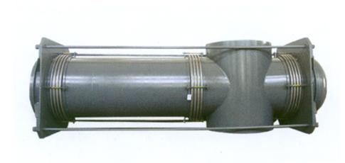 壓力平衡波紋膨脹節(jié)的前部(輸流端)有兩個工作波紋管,后部(盲端)有一個平衡波紋管構(gòu)成。工作波紋管吸收來自彎管段產(chǎn)生的橫向位移;平衡波紋管吸收來自直管段的軸向位移。
